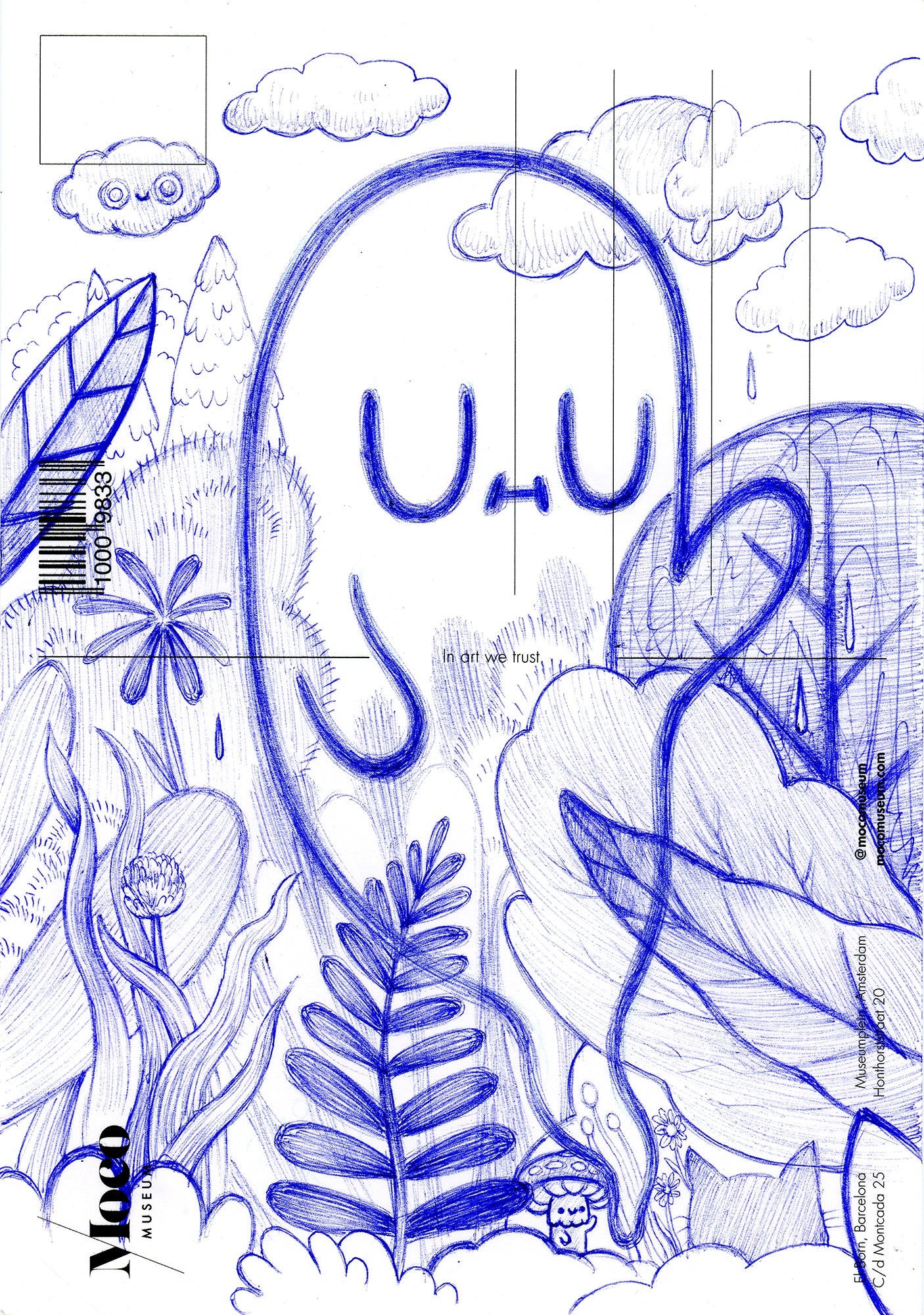 This is a memento from my first time in Barcelona. I sketched on a postcard a gift from the sweet staff at Moco Museum - they were grateful to me because I encouraged some American tourists, who had stopped by as the museum was closing and I was already on my way out, to come back and see the amazing exhibit the following day.